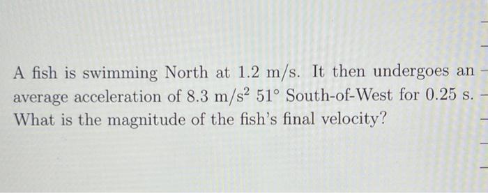 It then undergoes an average acceleration of 83 ms2 51 South-of-West for 025 s. It then undergoes an average acceleration of 83 ms2 51 degrees south of west for 025 s. What is the magnitude of the fishs final velocity.
